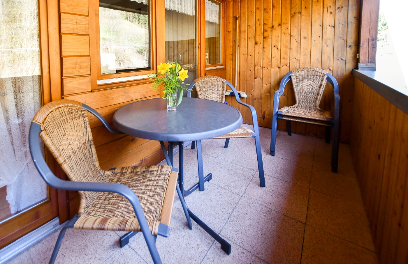eigener überdachter und windgeschützter Balkon mit Gartenmöbeln und Blick über den Hof
